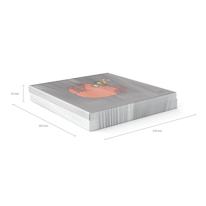 Тетрадь общая формата А5+ (170х203 мм). Обложка из высококачественного мелованного картона плотностью 190 г/м2. Отделка - выборочный УФ-лак. В блоке 48 листов в клетку с полями. Бумага офсетная плотностью 60 г/м2. Цвет линовки - синий. Скругленные уголки обложки и блока. Тип скрепления - скоба. Тетради разного дизайна упакованы в термоусадочную пленку по 5 штук.