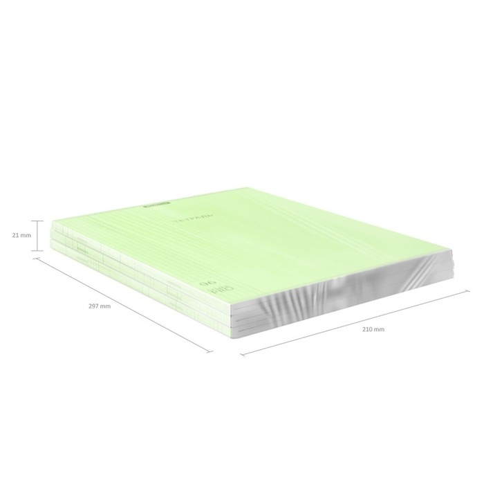Тетрадь общая ученическая формата А4 (210x297 мм). Двойная обложка: внешняя выполнена из высококачественного износостойкого цветного глянцевого пластика с фактурой «зеркало», внутренняя — из офсетной бумаги. В блоке 96 листов в клетку. Бумага офсетная плотностью 60 г/м2. Цвет линовки — синий. Скругленные уголки обложки и блока. Тип скрепления — скоба. Тетради упакованы в термоусадочную пленку по 5 штук.