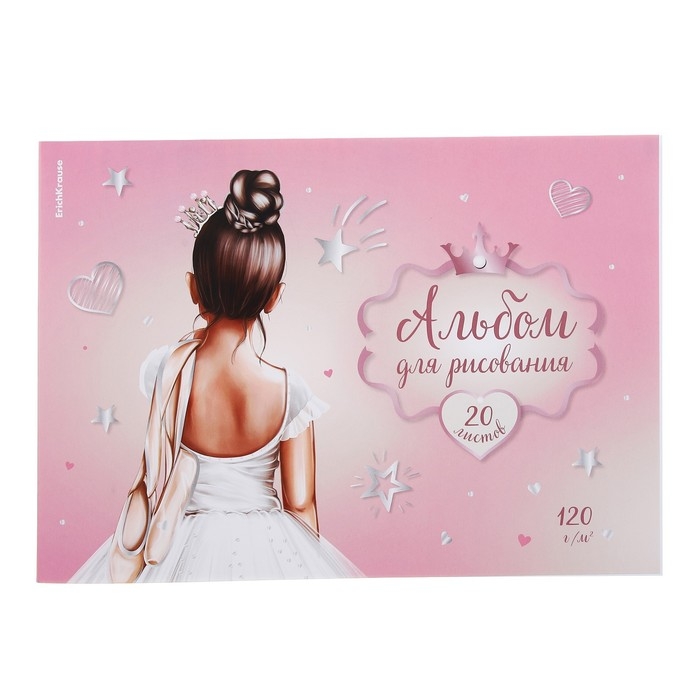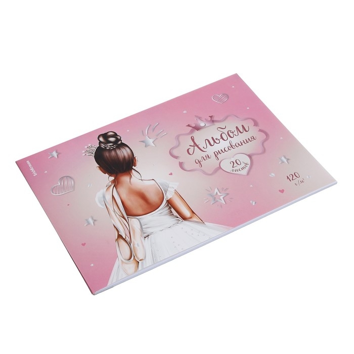 Альбом для рисования формата А4 (210х297 мм). Обложка из высококачественного мелованного картона плотностью 170 г/м2. Жесткая подложка 360 г/м2. В блоке 20 листов. Бумага плотностью 120 г/м2. Белизна бумаги - 100%. Тип скрепления - клей. Альбомы упакованы в термоусадочную пленку по 10 штук.