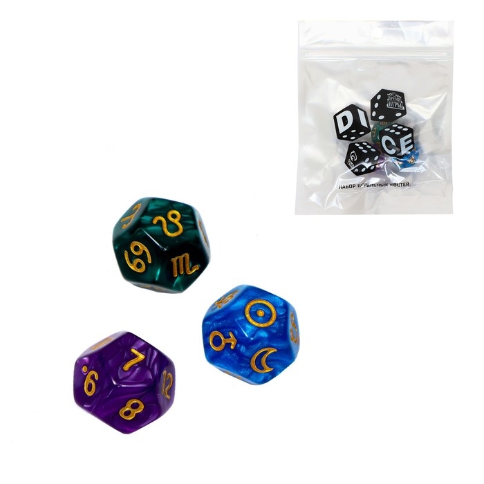 Набор астрологических кубиков, состоит из 3 костей, выполненных из акрила. Кубики подходят для гаданий, ритуалов и эзотерических практик.