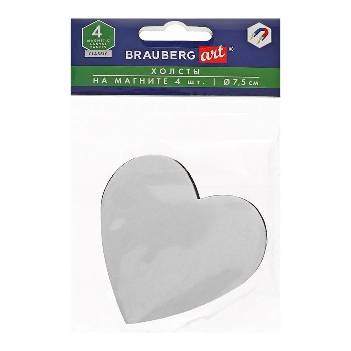 Холст на картоне с магнитои Сердце 7,5 см, хлопок 100%, акриловый грунт, набор 4 штуки, BRAUBERG