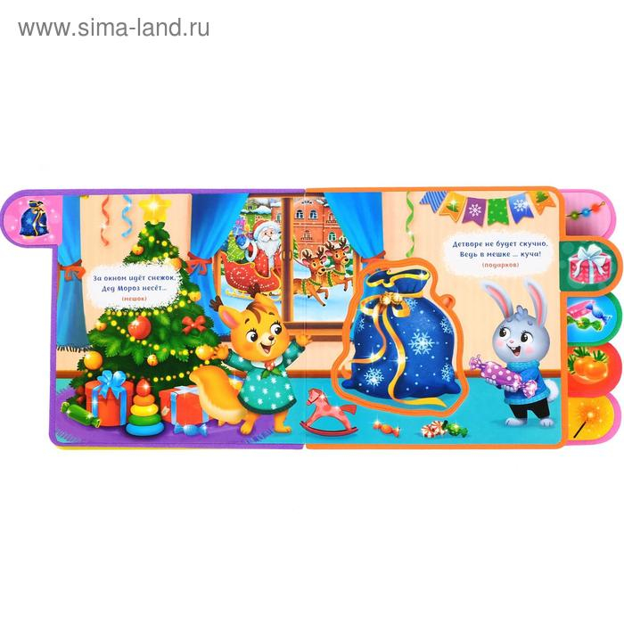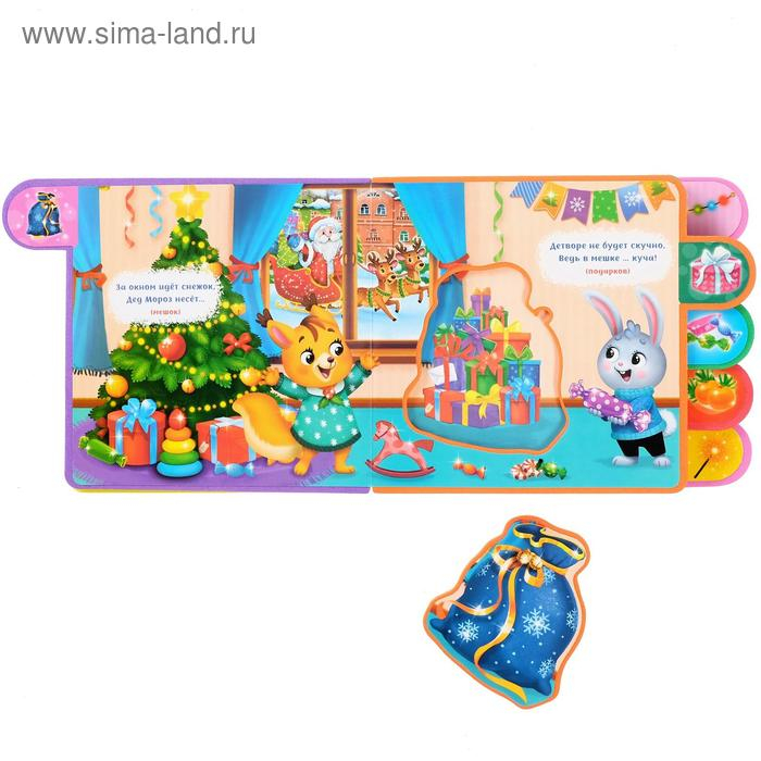 Внутри родители найдут праздничные загадки и 5 мягких пазлов-фигурок, которые можно вынимать. С деталями-вкладышами кроха потренирует моторику пальцев и будет увлечён во время чтения.
