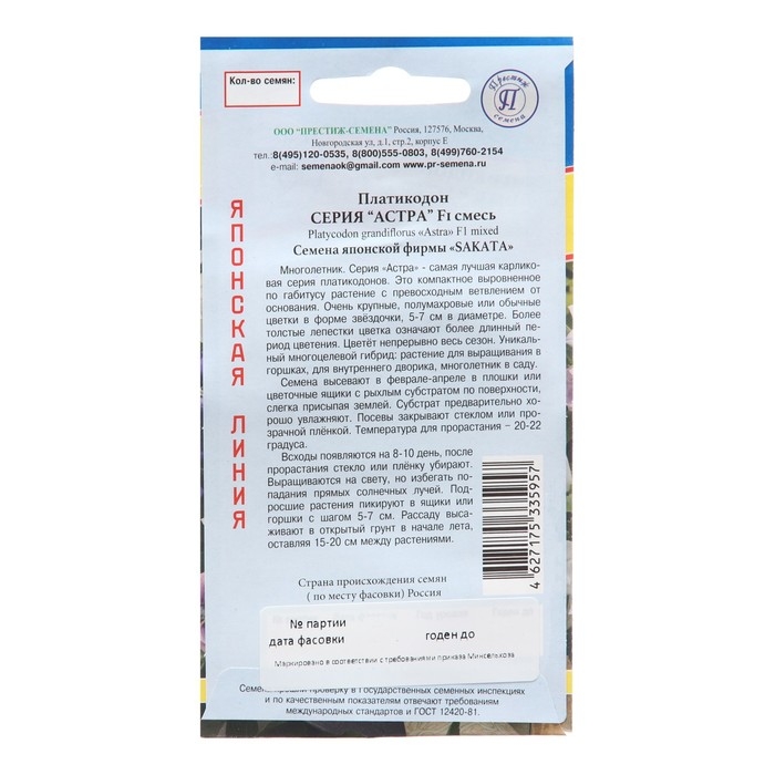Семена цветов Платикодон "Астра", Смесь, F1, 5 шт