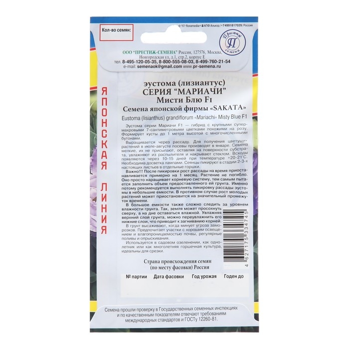 Семена цветов Эустома "Мариачи Мисти Блю", F1, драже, 3шт