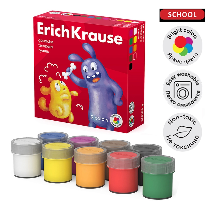 Гуашь 9 цветов х 20 мл, ErichKrause "Jolly Friends", в картонной упаковке