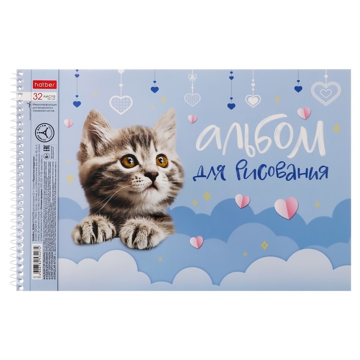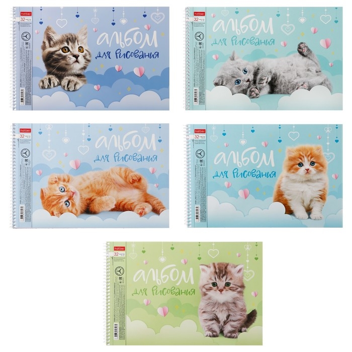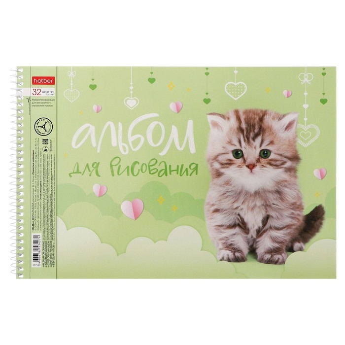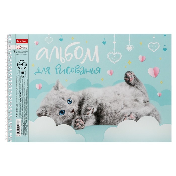 Альбом для рисования А4, 32 листа на гребне "Пушистые мордочки", обложка мелованный картон, перфорация на отрыв, блок 100 г/м2, МИКС