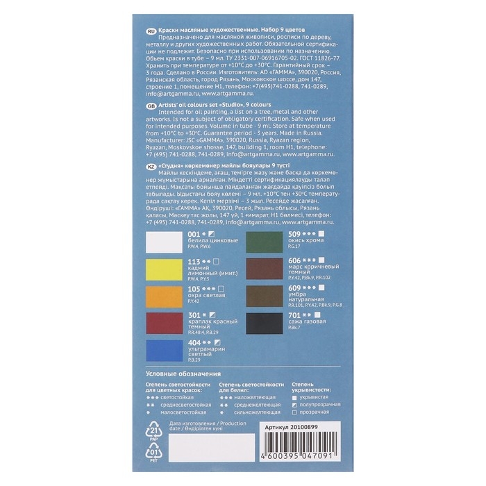 Масляные краски "Гамма" серии "Студия" изготавливаются из льняного масла, органических и неорганических пигментов.