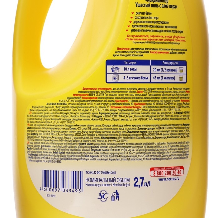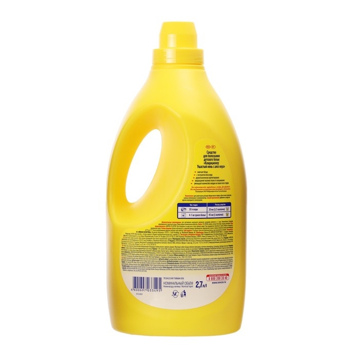 Кондиционер для детского белья «Ушастый нянь» с алоэ вера сделает вещи вашего ребёнка мягкими и приятными на ощупь. Средство подходит для всех видов тканей, в том числе для стирки одежды людей с чувствительной кожей. Кондиционер обладает антистатическим эффектом и облегчает глажку белья. Подходит для машинной и ручной стирки. Объём средства — 2,7 литра.