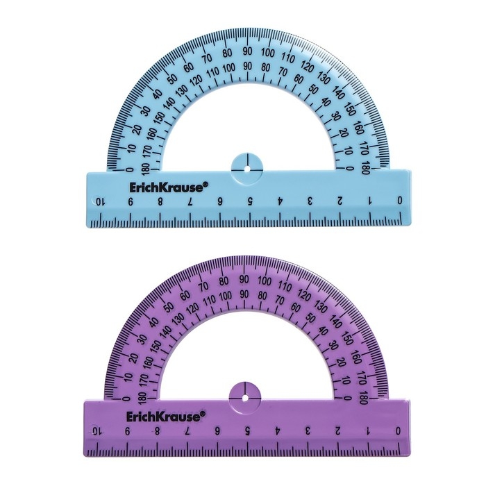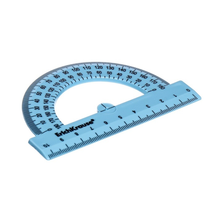 Непрозрачный транспортир 180 градусов из высококачественного пластика. Четкая печать двухсторонней шкалы. Длина разметки – 10см.