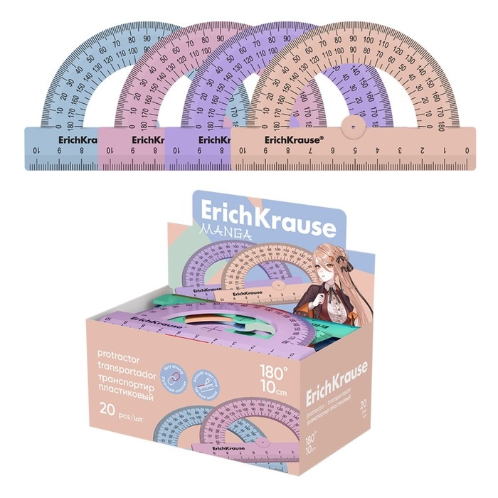 Транспортир 10 см 180°, ErichKrause "Manga", пластик, непрозрачный, коробка-дисплей, МИКС