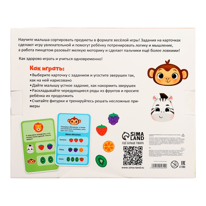 Внутри вы найдёте 20 пластиковых фигурок, 3 картонных сортера в виде животных и пинцет.