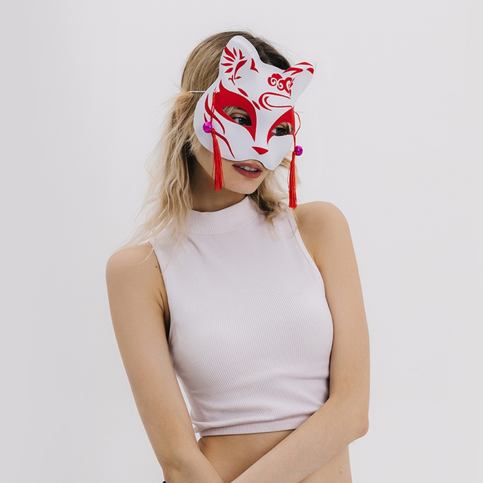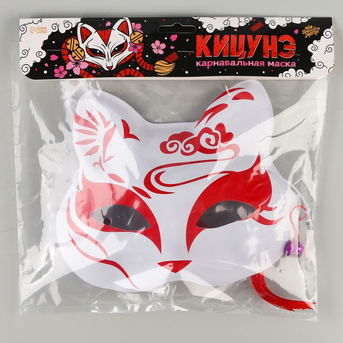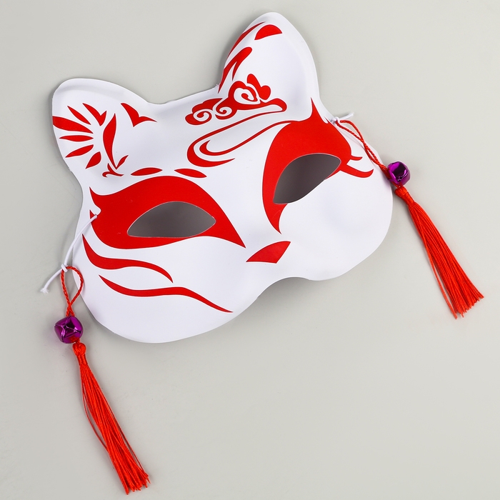 Познакомьтесь с карнавальной маской «Кицунэ» красно-белого цвета, которая воплощает дух японского искусства. Эта маска, украшенная изящными подвесками, станет выразительным акцентом вашего костюма и привлечёт внимание на любом мероприятии.