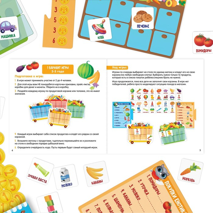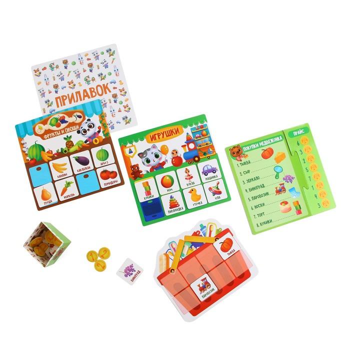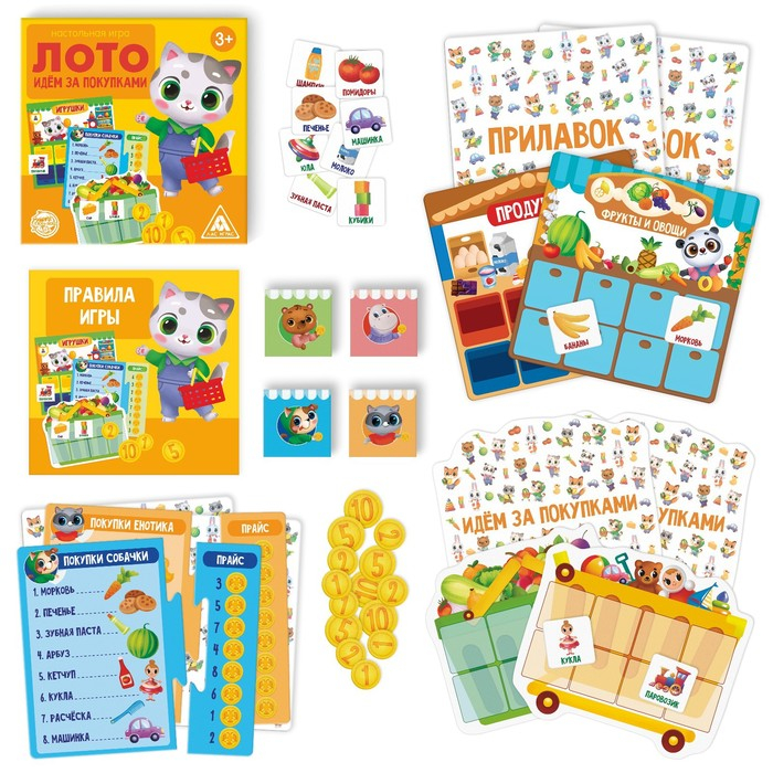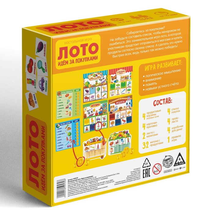 Настольная игра-лото «Идём за покупками», 32 жетона, 16 карт, 4 поля, 4 прилавка, 4 списка, 4 прайс-листа, 4 коробки для денег, 3+