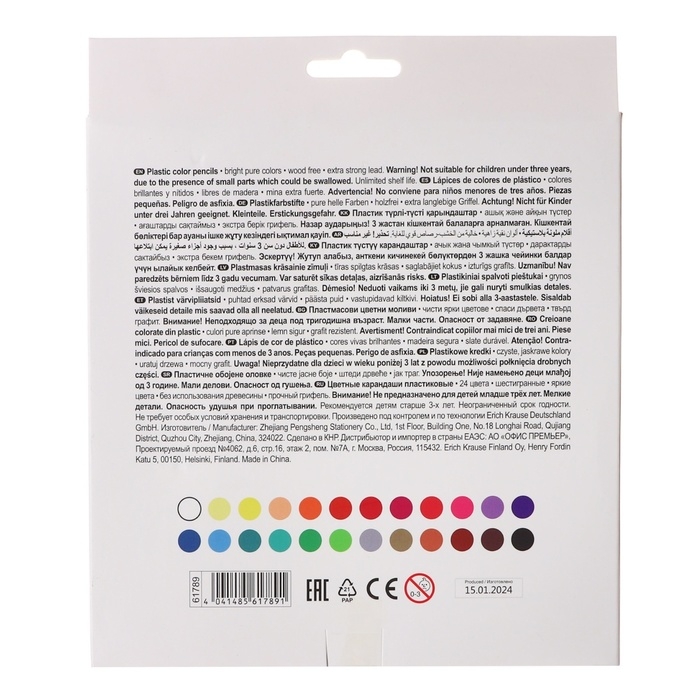Пластиковые цветные карандаши ErichKrause представлены широкой палитрой оттенков, которые позволяют создавать яркие реалистичные рисунки. Регулируя силу нажима, можно контролировать насыщенность оттенков и плавность перехода цветов. Благодаря шестигранной форме, карандаши удобно лежат в руке и не скатываются с поверхности. Специальная технология изготовления карандаша методом экструзии надежно фиксирует грифель к корпусу, что обеспечивает высокую ударопрочность. Идеальная центровка грифеля и пластичность материала карандаша гарантируют легкую заточку с экономным расходом карандаша. Грифель диаметром 2.6 мм не царапает бумагу, не крошится при рисовании и не ломается даже при сильном нажатии. Европейский сертификат качества (СЕ) гарантирует отсутствие в составе токсичных веществ.