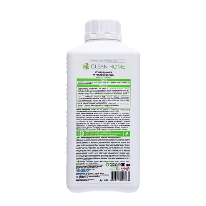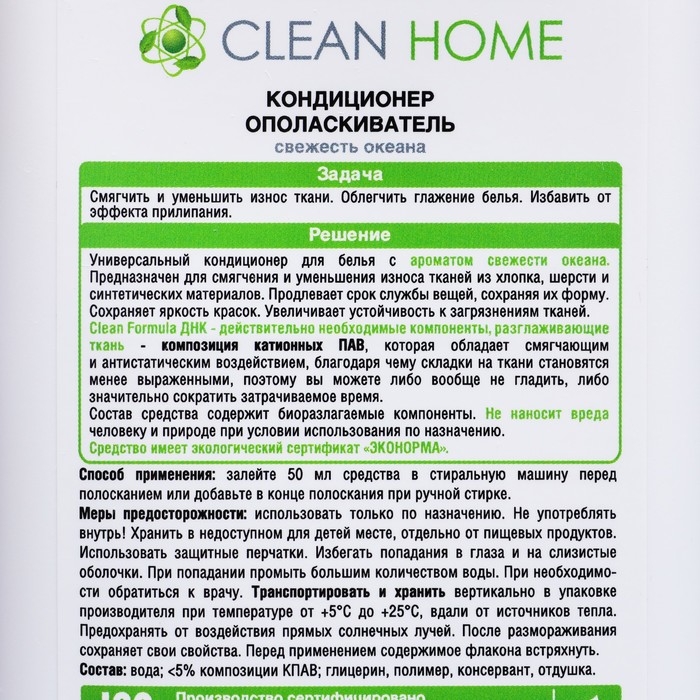 Кондиционер-опаласкиватель Clean home «Свежесть океана» - это универсальный кондиционер для белья предназначен для смягчения и уменьшения износа тканей, включая хлопок, шерсть и синтетические материалы. Он продлевает срок службы вещей, сохраняет их форму, а также яркость красок и увеличивает устойчивость к загрязнениям.