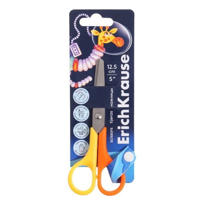 Ножницы с лезвиями из высококачественной нержавеющей стали с безопасными закругленными концами лезвий. Не ржавеют. Ручки классической формы изготовлены из ударопрочного пластика. Товар поставляется в нескольких вариантах цвета/дизайна без возможности выбора. Подходят для левшей.