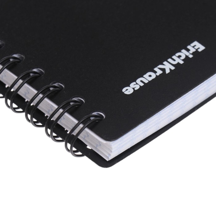 Блокнот формата А6 (102х146 мм). Обложка из высококачественного износостойкого матового пластика с фактурой «песок». Стильный дизайн выполнен печатью белой краской. В блоке 80 листов в клетку. Бумага офсетная плотностью 60 г/м2. Цвет линовки - синий. Скругленные уголки обложки. Тип скрепления - спираль. Блокноты упакованы в термоусадочную пленку по 5 штук.