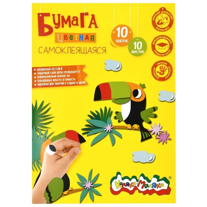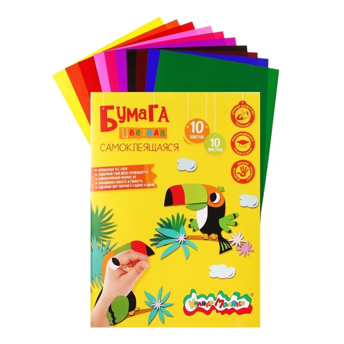 Бумага цветная самоклеящаяся А4 10 цветов 10 листов "Каляка-Маляка", мелованная, в папке