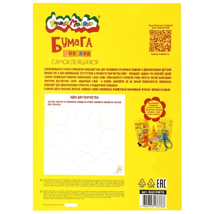 Прекрасный набор самоклеящейся бумаги – 10 классических цветов дополнят уже существующий в Каляке-Маляке набор самоклеящейся флуоресцентной бумаги. Бумага плотная и гибкая, а защитный слой легко отклеивается. Аппликации без клея – прекрасны как дома, так и в путешествиях.