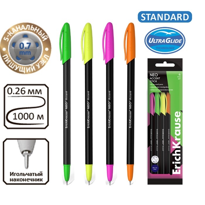 Набор ручек шариковых 4 шт, ErichKrause, "Neo Stick Accent" узел 0.7 мм цвет синяя