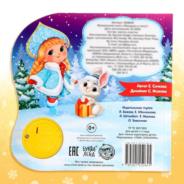 Страницы книги выполнены из плотного картона. Музыкальный чип работает от батареек, входят в комплект.