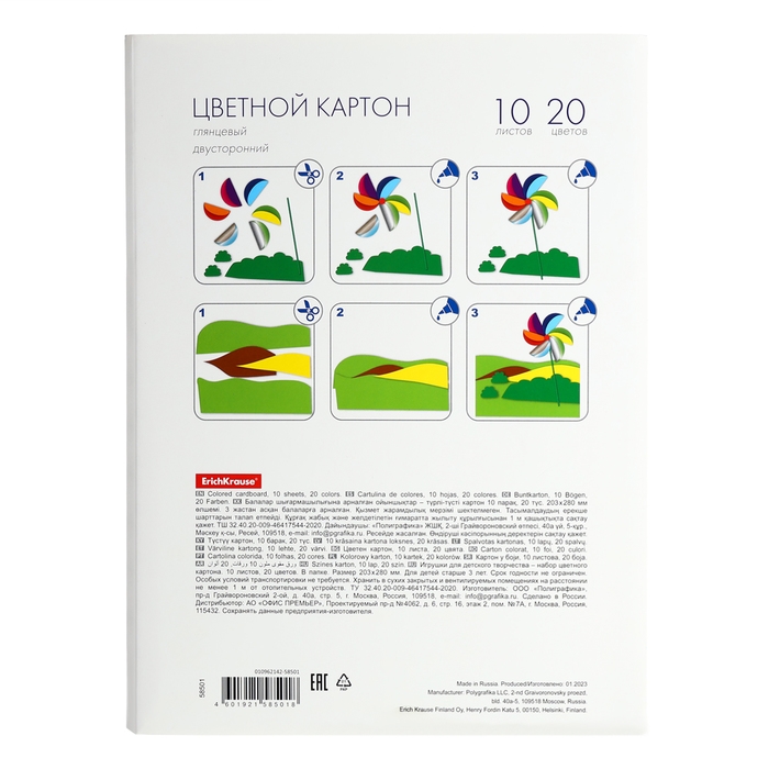 Цветной картон мелованный двусторонний формата А4 (203х280 мм). Яркие насыщенные цвета. В папке 10 листов, 20 цветов. Плотность наполнения — 170 г/м2. Папка из плотного картона. Упакован в термоусадочную пленку по 5 штук