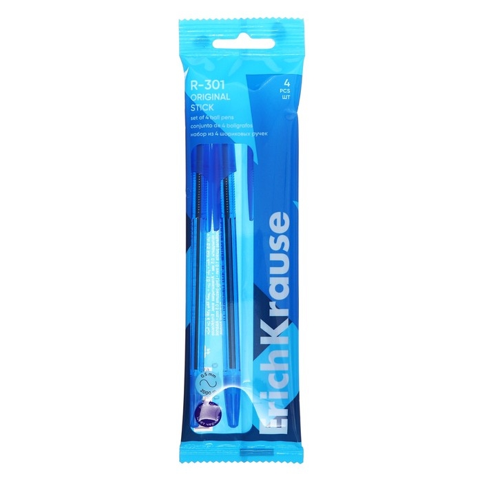 Набор ручек шариковых 4 штуки ErichKrause R-301 Stick Original узел 1.0мм, цвет синий