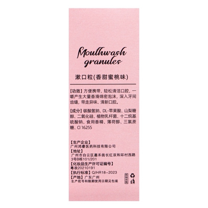Состав: бикарбонат натрия, яблочная кислота, сорбит, кремнезем, лактобактерии, додекаэдр, сульфат натрия, ароматизатор персика, ментол, триоксиан, сахар, CI16255