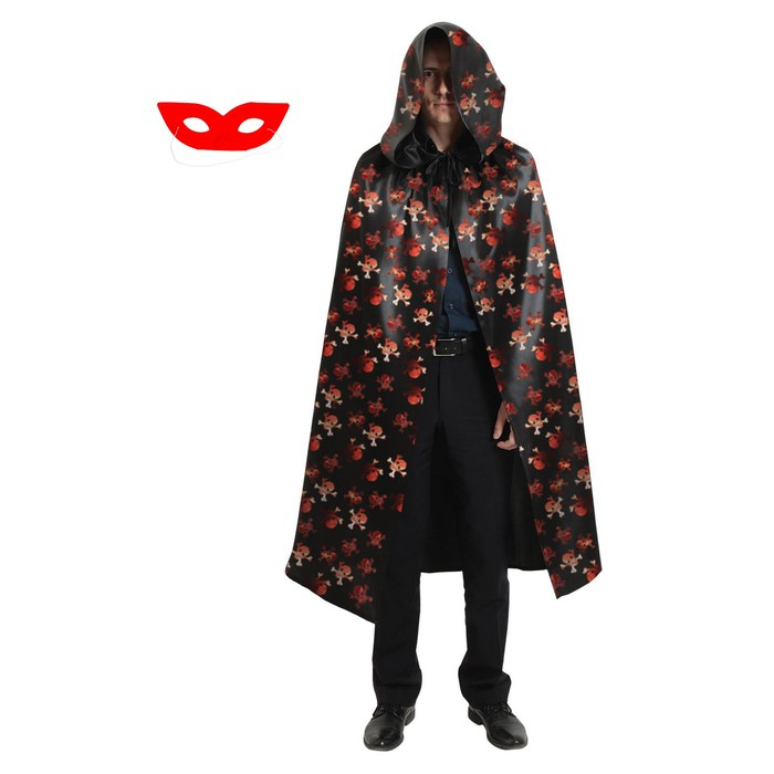 Карнавальный плащ с красными черепами и капюшоном, атлас, длина 120 см + маска