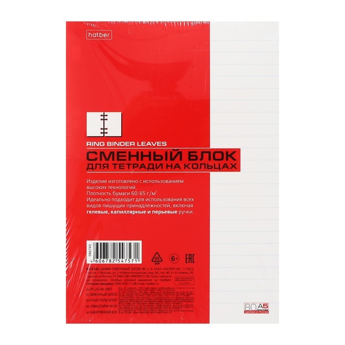 Сменный блок для тетрадей на кольцах А5, 80 листов в линейку, в индивидуальной упаковке, блок 60 г/м2