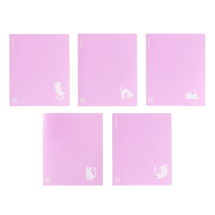 Тетрадь общая ученическая формата А5+ (170x203 мм). Обложка выполнена из высококачественного износостойкого матового пластика с фактурой «песок» и печатью белой краской. В блоке 48 листов в клетку. Бумага офсетная плотностью 60 г/м2. Цвет линовки — синий. Скругленные уголки обложки и блока. Тип скрепления — скоба. Тетради разного дизайна упакованы в термоусадочную пленку по 5 штук.