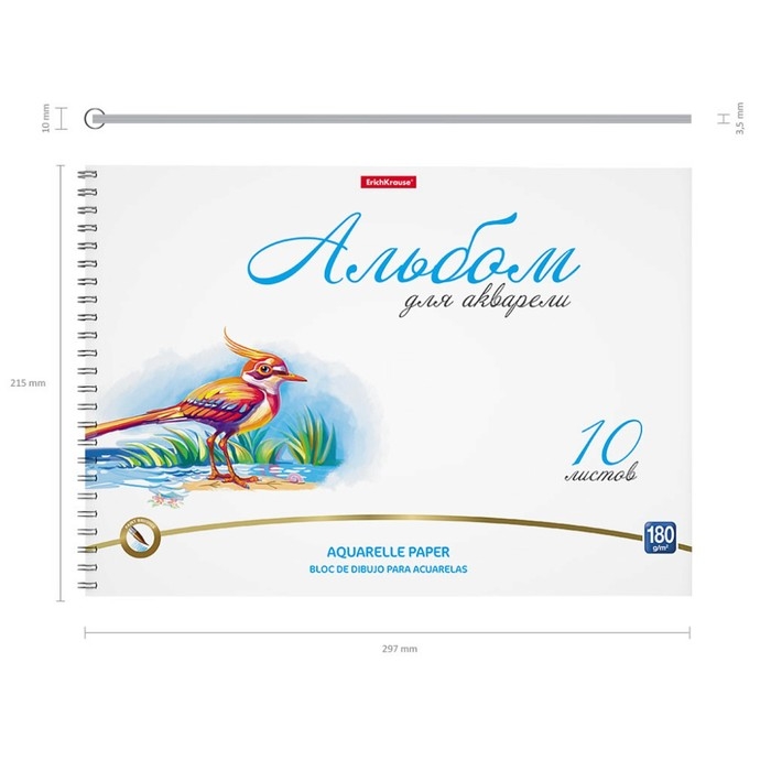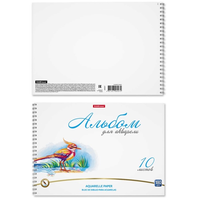 Альбом для акварели А4, 10 листов на спирали, Erich Krause Birds, блок 180 г/м², экстра белая, перфорация для отрыва, твердая подложка