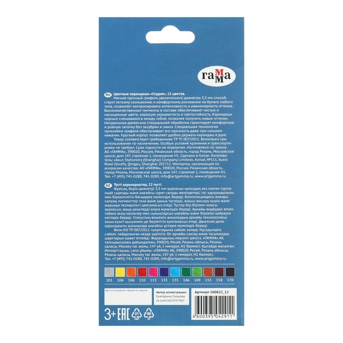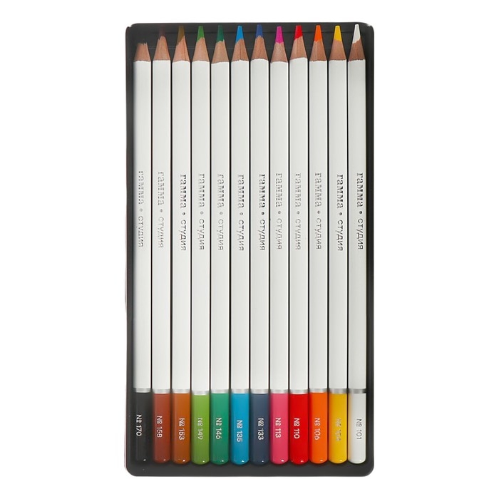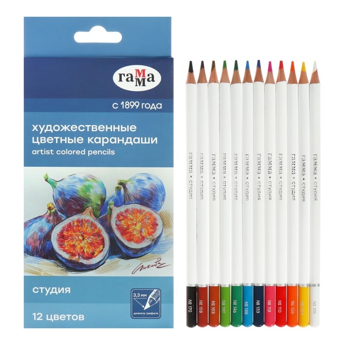 Художественные цветные карандаши ГАММА серии «Студия» позволяют прорисовывать как четкие контуры, мелкие графичные детали, так и тонкие переливы. В наборе 12 ярких и насыщенных цветов. Все цвета отлично смешиваются между собой, наслаиваются друг на друга, позволяя создавать плавные переходы и градиенты. Имеют высокую светостойкость. Диаметр грифеля – 3,3 мм. Карандаши изготавливаются из высококачественных тонкотертых пигментов, что обеспечивает высокую интенсивность и чистоту цвета. Грифель выполнен по технологии двойного проклеивания. Благодаря этому он не ломается, не крошится и затачивается до максимальной остроты. Круглый корпус карандаша диаметром 7,7 мм выполнен из липы. Представлены в удобной картонной упаковке в креативном дизайне.
