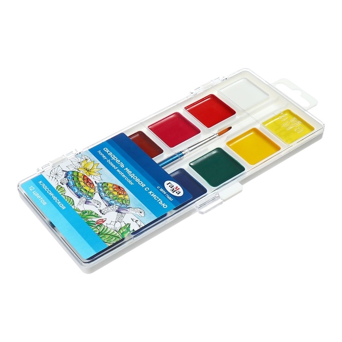 Акварель 12 цветов Гамма "Классическая", медовая, с кистью, пластиковая упаковка, европодвес (1009201)