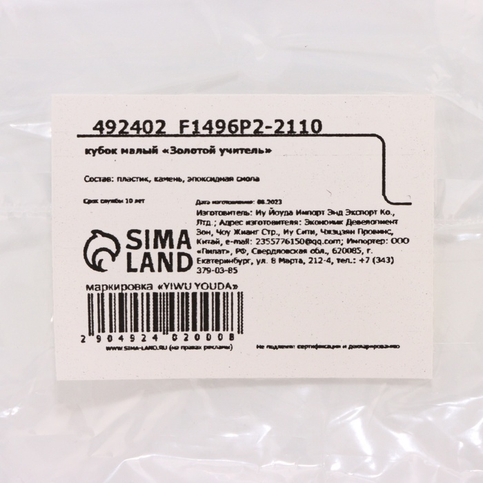 Кубок «Золотой учитель», наградная фигура, пластик, золото, 13 х 8 х 5 см.