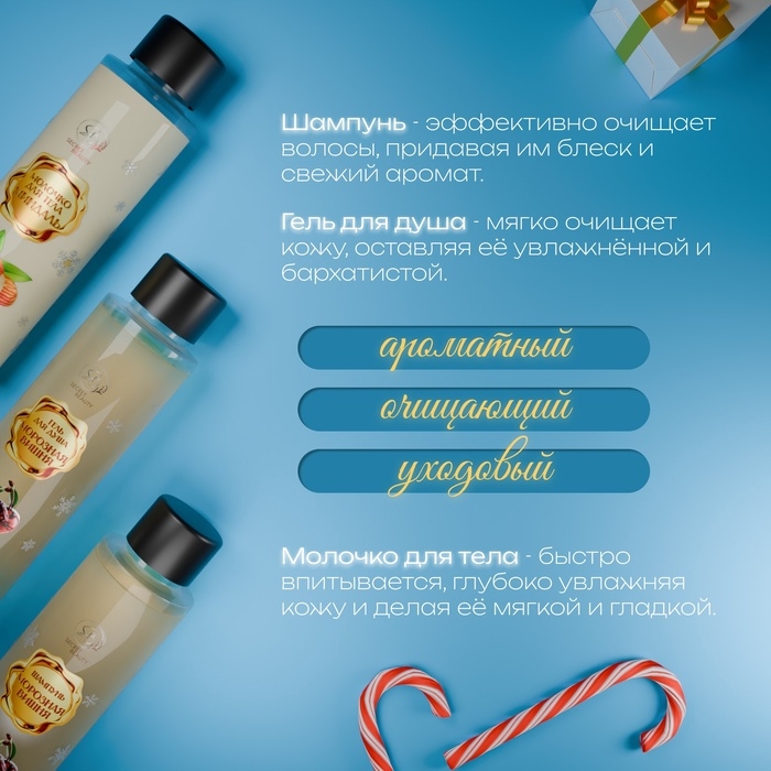 - Гель для душа — его нежная текстура мягко очищает кожу, создавая приятные ощущения свежести и комфорта. Ароматный шлейф геля наполняет душу ощущением праздника, а кожа остаётся увлажнённой и бархатистой на ощупь.