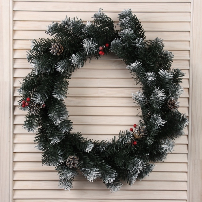 Новогодний венок "Рождественский белоснежный шишками серебро+ягодки" (55 см)