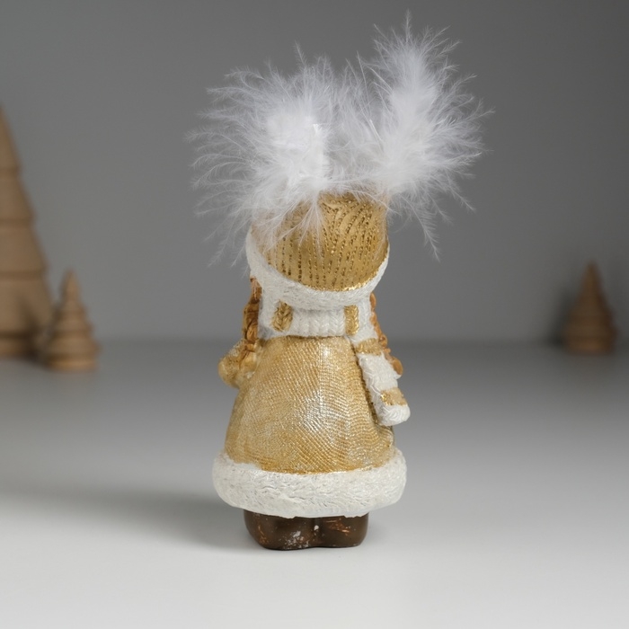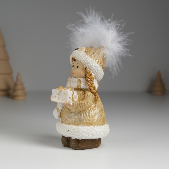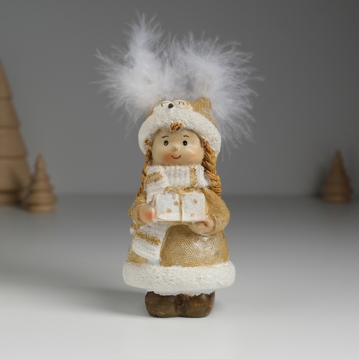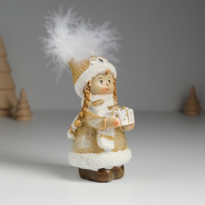 Сувенир полистоун "Девочка в шапке-сове, в золотистой шубке, с подарком" 6х5,5х11,5 см