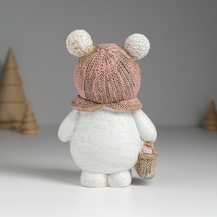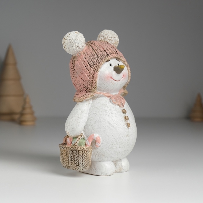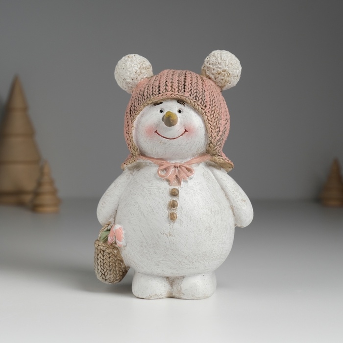 Сувенир полистоун "Снеговик в шапке с помпошками, с корзинкой" 8,5х5,5х13 см