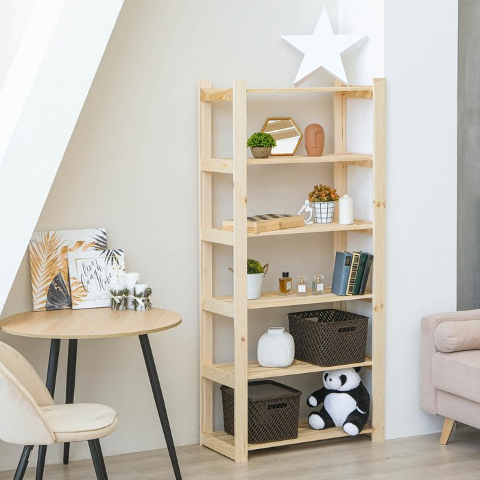 Открытый компактный стеллаж, сделанный из массива хвои, самый бюджетный в нашей серии. Он станет полезной частью гостиной, спальни, детской комнаты, квартиры-студии или офисных помещений.