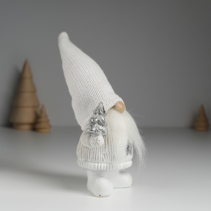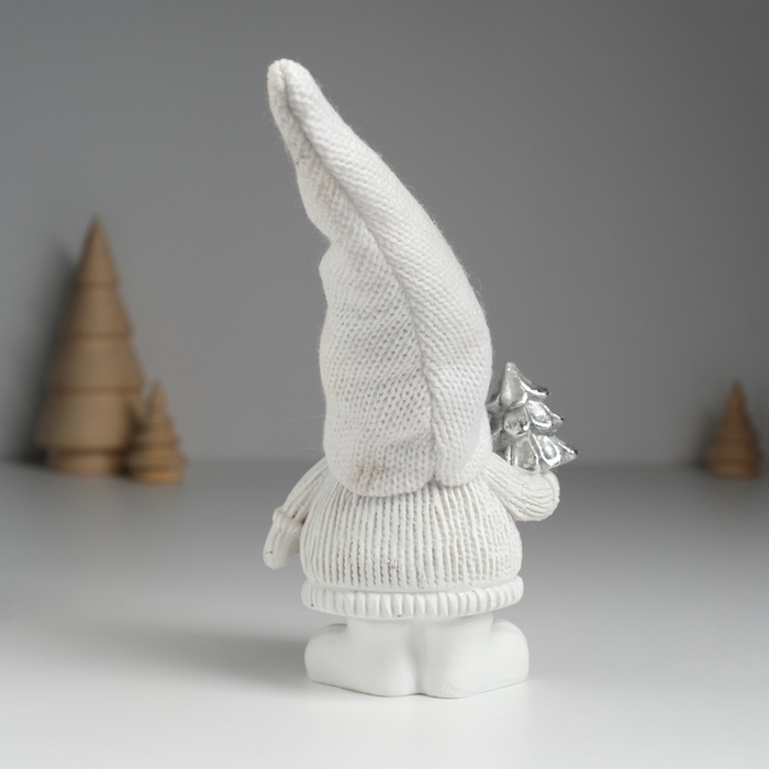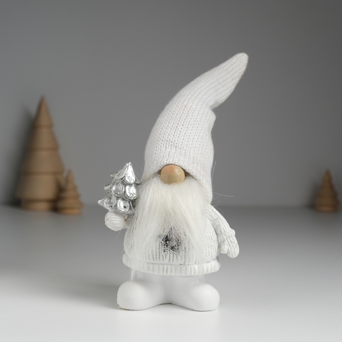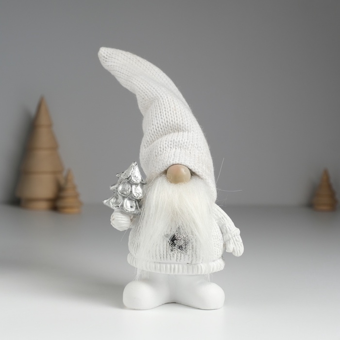 Сувенир полистоун "Дед Мороз в белом вязанном колпаке, с серебристой ёлочкой" 8,5х5х18 см