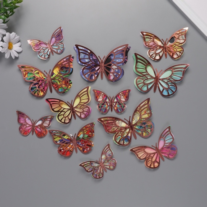 Наклейка бумага, пластик "Бабочки, цветные пятна" розовые набор 12 шт 12 см, 10 см 8 см