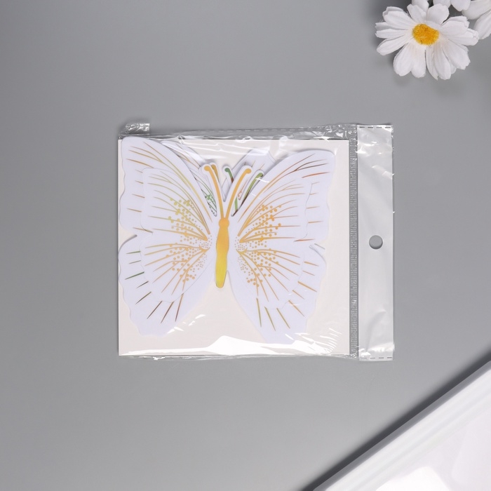 Наклейка пластик "Бабочки белые с золотом" двойные крылья набор 12 шт 12 см, 10 см 8 см