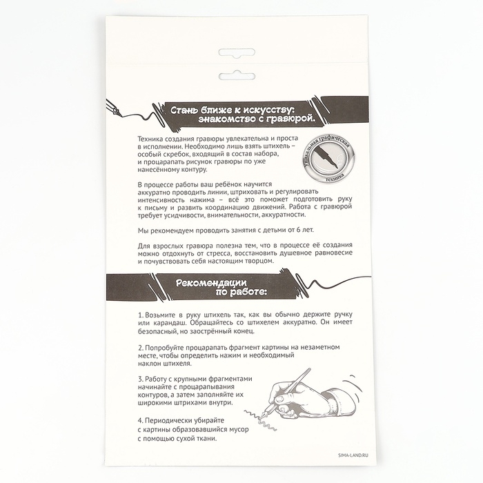 Гравюра представляет собой многослойное панно, покрытое чёрной краской, на которое нанесён контур рисунка. С помощью особого скребка (штихеля), который входит в набор, путём процарапывания и создается гравюра.