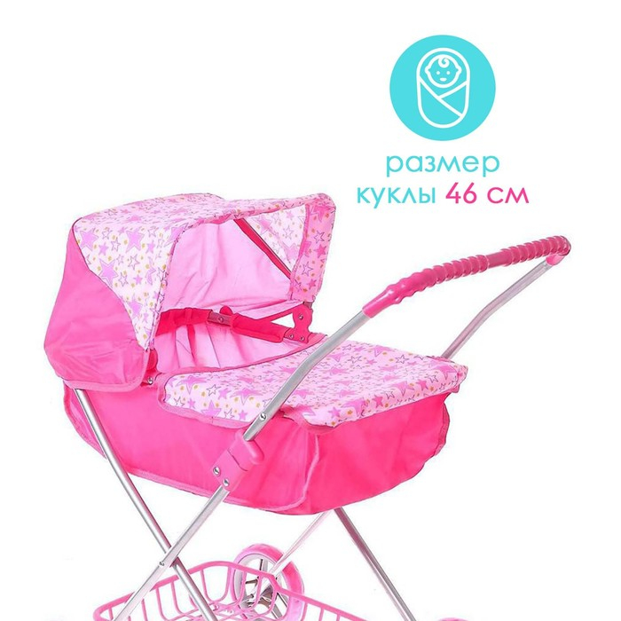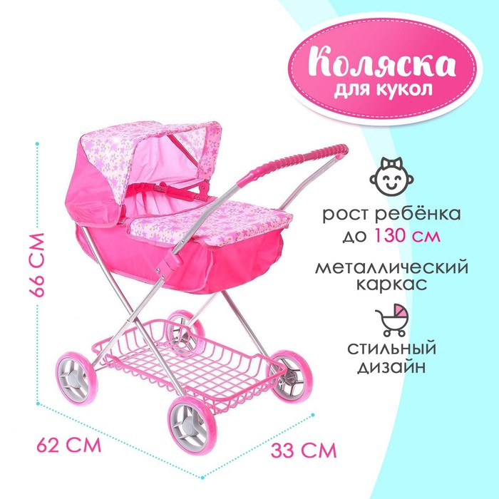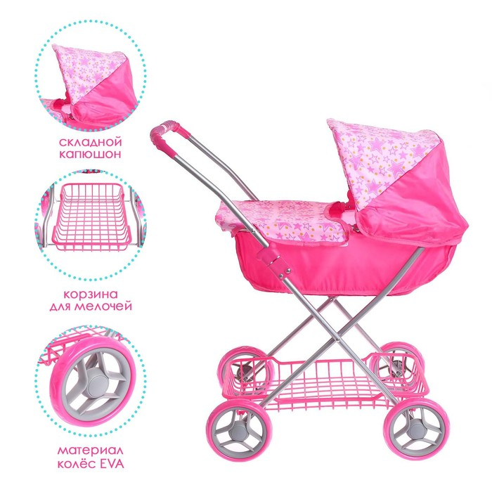 Коляска складывается и занимает мало места. Корзина в комплекте будет служить местом хранения для всех необходимых вещей ребёнка и его пупса. Рекомендуется играть в тёплую погоду.