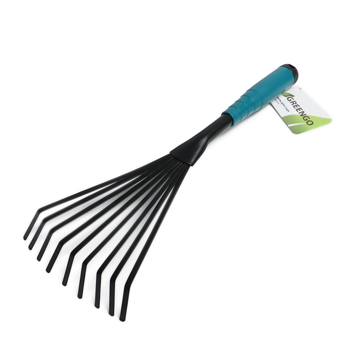 Грабли малые, веерные, пластинчатые, 9 зубцов, длина 52 см, металл, металлическая рукоять с резиновой ручкой, Greengo