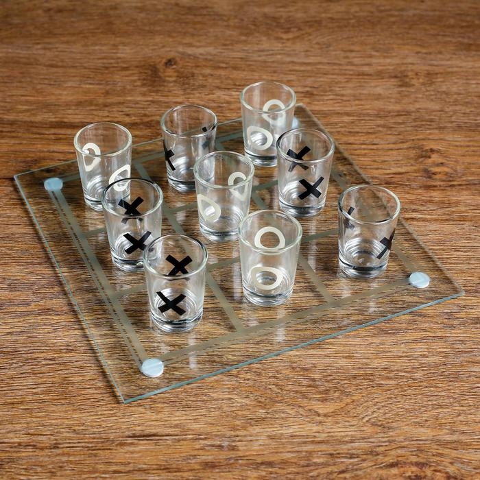 Алкогольная игра "Крестики нолики": 9 рюмок, 20х20 см - это увлекательная игра, а также прикольный подарок для тех, кто ценит юмор и оригинальность. Рюмки с изображением крестиков и ноликов находятся на стеклянной, разделенной на клеточки, подставке, она же является игровым полем. Вы можете разлить по рюмкам горячительный напиток и играть ими. Победитель может выпивать рюмки проигравшего каждый раз, когда обыграет своего противника.