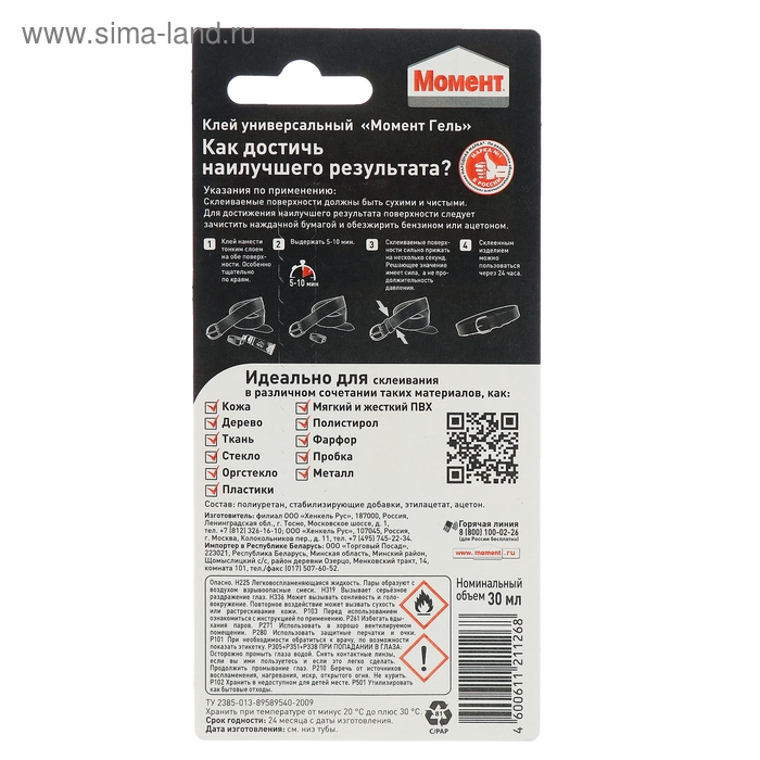 Надежный Клей Момент "Гель" идеально подходит для комбинационного склеивания мягкого и жесткого ПВХ, полистирола, оргстекла и других пластиков, дерева, резины, кожи, пробки, ткани, поролона, бумаги, картона, стекла, фарфора, керамики, вспененных материалов, металлов и многих других материалов.