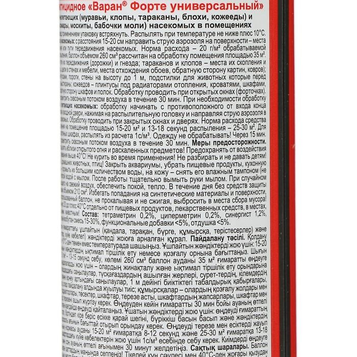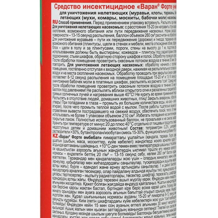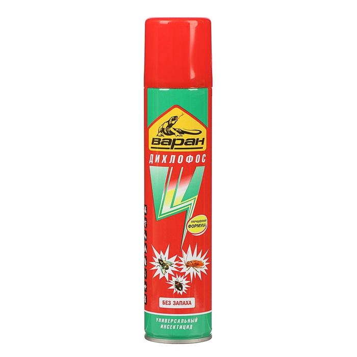 На природе и дома многие люди сталкиваются с клещами, клопами, москитами и другими опасными насекомыми, которые способны причинить массу вреда. Они переносят инфекцию, пьют вашу кровь и просто раздражают своим внешним видом. Вы устали бороться с ними? Дихлофос от торговой марки «Варан» — высокоэффективное средство для уничтожения ползающих (тараканов, муравьёв, клопов и т. д.), а также летающих насекомых (мух, москитов, комаров). Способ применения: перед использованием хорошо взболтайте, распылите. Состав: тетраметрин 0,12 %, циперметрин 0,2 %, пиперонилбутоксид 0,4 %, отдушка менее 5 %, функциональные добавки менее 5 %, смесь бутан / пропан / изобутан более 30 %, растворители более 30 %. Способ применения: перед использованием хорошо взболтайте, распылите.