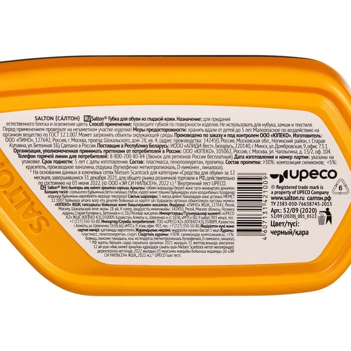 Способ применения: снимите крышку, без нажима проведите губкой по поверхности обуви. После использования плотно закройте крышку. Не использовать для замши, нубука или ткани.